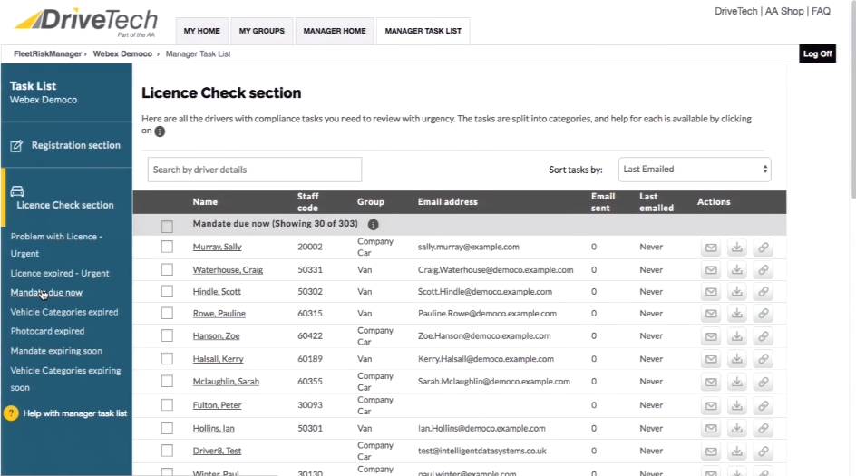 Actions are available for all categories to help you manage compliance. All categories allow standard emails to be sent to users. Download and Driver Consent actions are also available to help with data protection mandate completion.